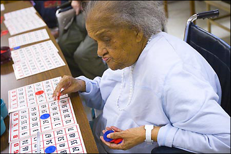 In a small way, Gray is being paid back for her bedside kindnesses decades ago. Every Saturday afternoon, she’s among a group of Vernon Hall regulars who play bingo in the home’s recreation room. Calling the numbers and checking the cards are undergraduate volunteers from Harvard.