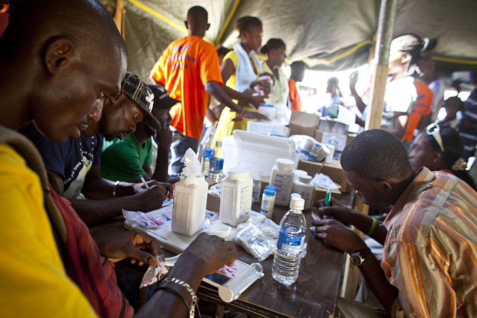 Justin Ide/Harvard Staff Photographer Employees and volunteers from Partners In Health distribute medicine at a mobile health clinic within a camp for internally displaced persons that holds about 45,000 people.