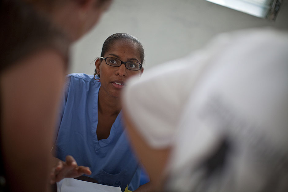 Justin Ide/Harvard Staff Photographer Natsha Archer (right), volunteer coordinator for Partners In Health and resident in global health at Brigham and Women’s Hospital, talks with Louse Ivers, a Harvard-affiliated doctor, about staffing issues at the University Hospital in Port-au-Prince.