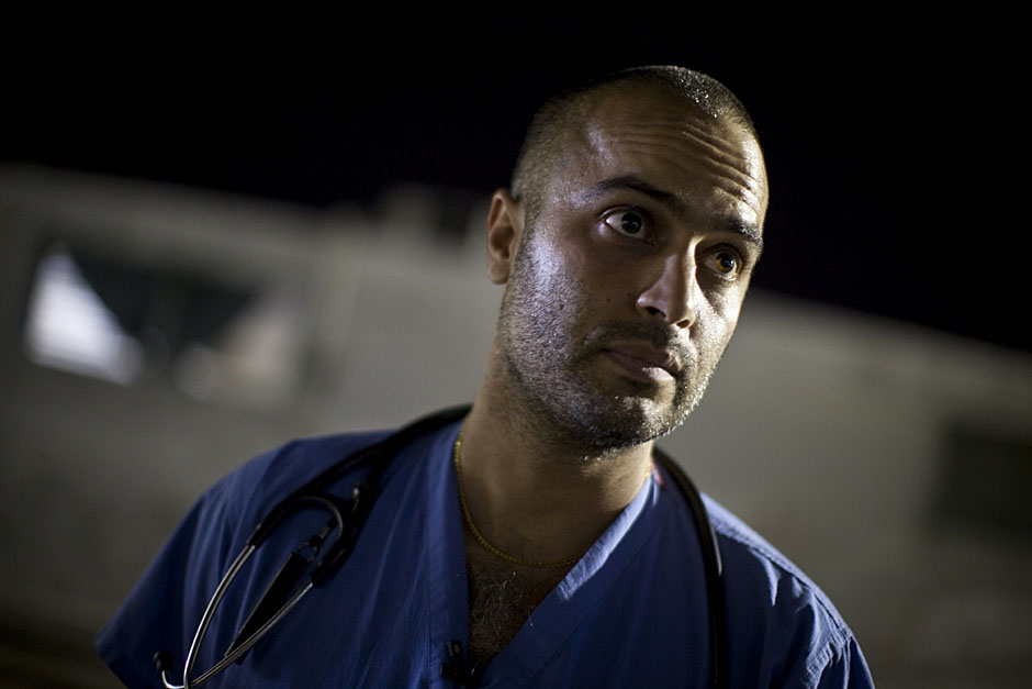 Justin Ide/Harvard Staff Photographer Doctors check on a patient with a crushed leg in the triage tent.