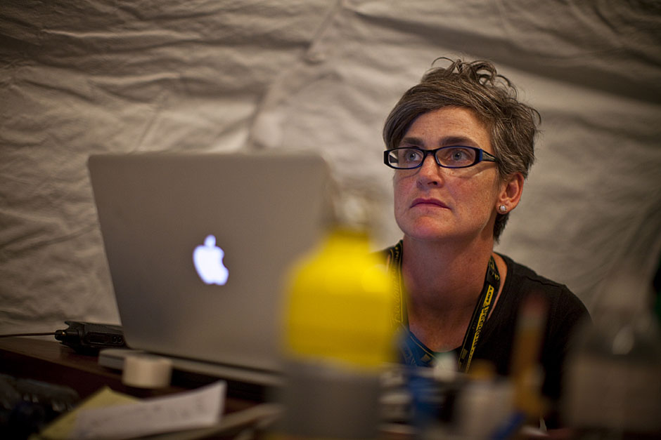 Justin Ide/Harvard Staff Photographer At Fond Parisien, Haiti, Michael VanRooyen (from left), Hilarie Cranmer, Jennifer Chan, Christian Theodosis, and Emilie discuss the needs of the camp and how to get funding for their relief work. Justin Ide/Harvard Staff Photographer Hilarie Cranmer from Harvard Humanitarian Initiative listens to the discussion.