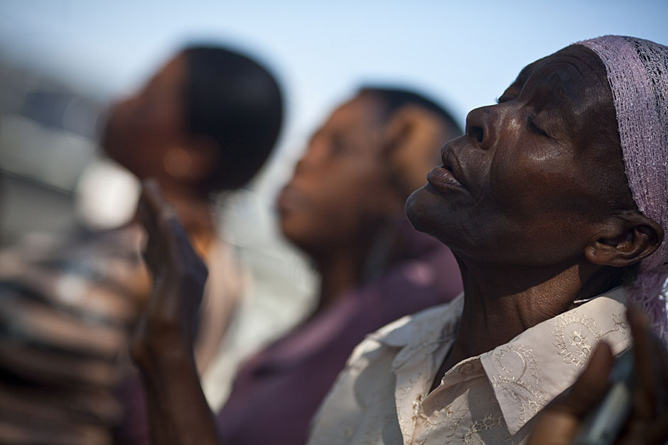 Justin Ide/Harvard Staff Photographer A woman prays during Sunday church service on the grounds of the field hospital.