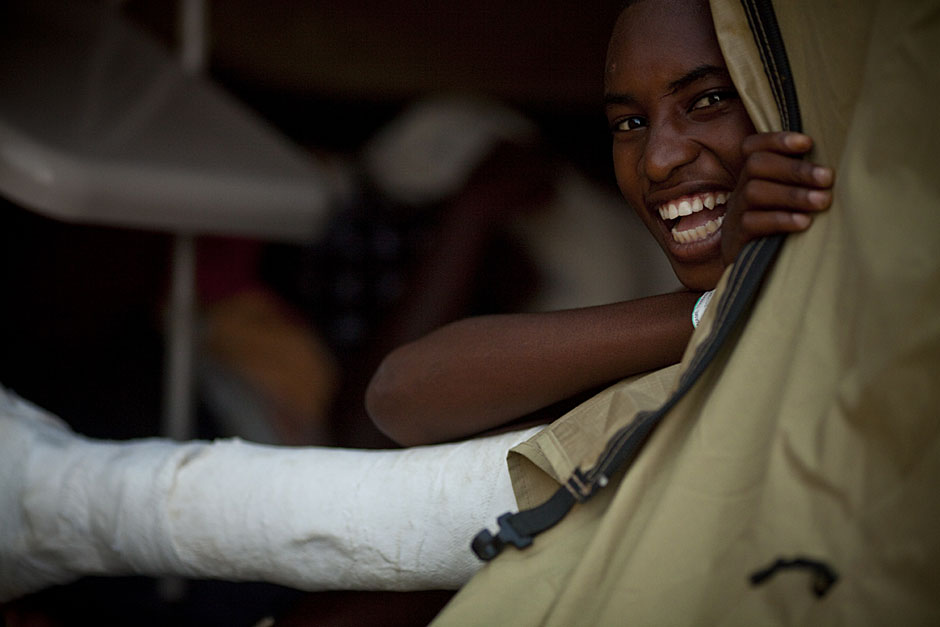 Justin Ide/Harvard Staff Photographer A young girl in the triage tent at the rehabilitation hospital in Fond Parisien, Haiti.