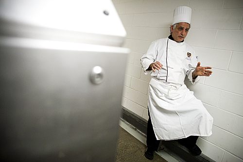 Richard Spingel, chef production manager, wears a Veritas chef’s coat while he works in the culinary lair below Kirkland House.