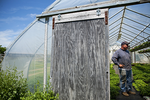 Ward looks over some of his crops; behind him, a sweeping view of the fields.