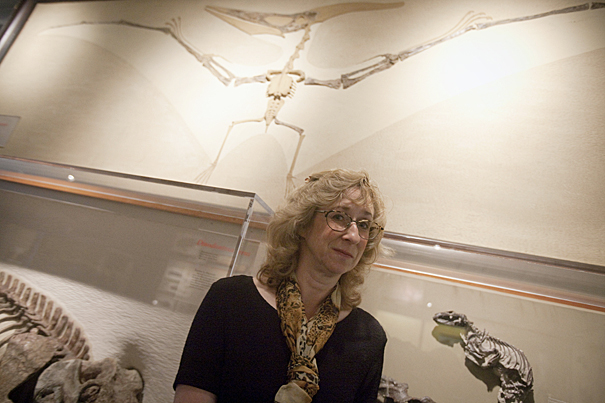Wildlife author Sy Mongtomery, author of “Birdology,” has a Pteranodon as backdrop before her lecture at the Harvard Museum of Natural History.