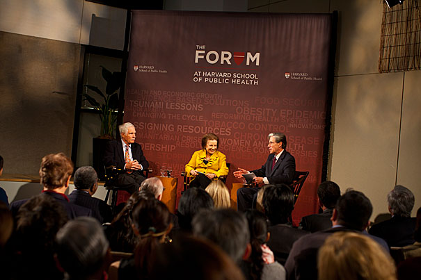 Launching The Forum at Harvard School of Public Health, a high-profile foray into health communications, were CNN founder Ted Turner (from left), former health editor of The Washington Post Abigail Trafford, and Dean Julio Frenk. During the hour-long program, Frenk discussed key challenges in global health.
