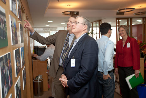 Before sitting down at a conference table made of three kinds of (certified) Brazilian wood for a conversation with Harvard’s Brazil-based team, Faust took a few minutes to carefully study photos of the more than 450 Harvard students and dozens of faculty who have engaged in Brazil since the opening of the office in mid-2006. A group shot of the first Harvard-Brazil Symposium in 2007, including the now familiar faces of Jorge Paulo Lemann ’61 and DRCLAS Director Merilee Grindle caught her eye. Meanwhile, James Rothenberg ’68, M.B.A. ’70, Harvard’s treasurer, stopped in front of a picture of a young boy taken during a January 2010 Collaborative Public Health Field Course in Bahia. The boy was using a wooden pole and bucket designed by students to fish his soccer ball out of a snail-infested river without running the risk of contracting schitosomiais.