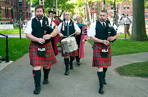 Dressed in colorful tartan kilts, four members of the Stuart Highlanders Pipe Band from Wilmington, Mass., traversed campus in the early morning on their way to breakfast after waking seniors from Lowell and Eliot Houses with their playing and leading them to the Yard. But the piping procession encountered a couple of hazards along the way. “I did have a game of chicken with an elderly woman in a car,” laughed piper Matt Phelps. “She was trying to get in front of the parade.” Also treacherous, he said, was a game of chicken with a competing fife-and-drum group that was “playing in a different key.”