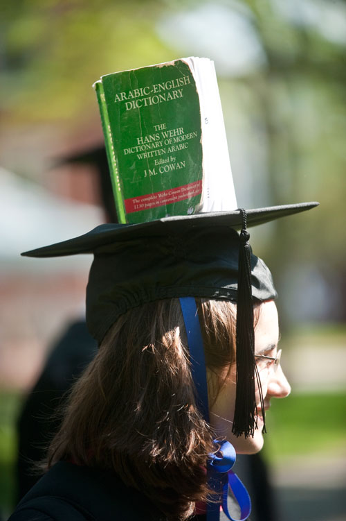 Alice Gissinger went literal, plastering Hans Wehr’s “Dictionary of Modern Written Arabic” atop her mortarboard. It made a fitting tribute to her undergraduate years, she said. “It’s every Arabic student’s co-pilot.”