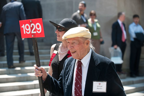 University records don’t say who the oldest living Harvard and Radcliffe graduates are. But the oldest Harvard grads at Thursday’s afternoon ceremonies were Donald F. Brown ’30, A.M. ’35, Ph.D. ’55, of Stow, Mass., and George Barner ’29 of Kennebunk, Maine. Both are 102, though Brown is a month older. The two sat with family members at separate tables under the same tent behind Stoughton Hall in the Yard, where there is a traditional “tree spread” for older classes. Brown wore a ball cap that said “My life is in ruins.” (He’s a retired archaeologist.) Barner, a retired lawyer, gave up driving at age 100, “but my license to drive is still good.” Both sat while the alumni line formed, but they walked in the procession itself. Barner, representing the oldest class present, took the lead.