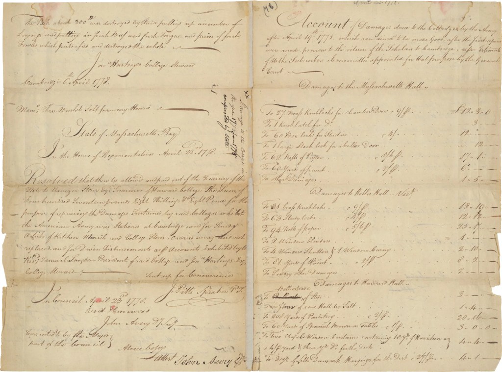 The British surrendered Boston in March, 1776, but the American troops who had bivouacked around Harvard Yard inevitably left a trail of damages when they moved south. The soldiers whom Harvard President Samuel Langdon called a “glorious army of freemen,” tore off the roof of Harvard Hall — 1,000 pounds of metal – to melt into bullets. They stripped brass doorknobs and box locks out of the buildings, along with interior woodwork. In 1778, Harvard petitioned the Massachusetts House of Representatives, listing losses down to the shilling and pence. The College was awarded the sum of 417 pounds.