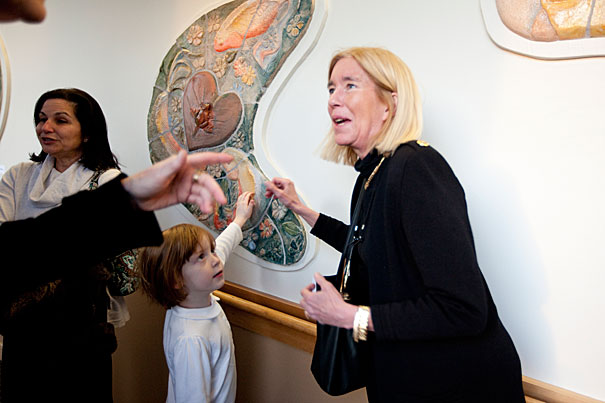 Artist Pam Ward (right) introduced her neighbor’s granddaughter, Clara Marttila, age 5, to her art when collaborative murals were unveiled at Cambridge Health Alliance. Ward, and others, are part of the Ceramics Program at Harvard’s Office for the Arts.