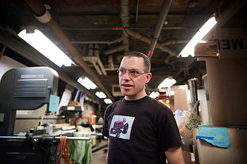 Woodshop manager George Kenty closes the shop for the day and departs with his faithful bike.