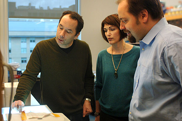 “This compound could inspire novel therapeutic approaches to a variety of autoimmune disorders,” said Harvard School of Dental Medicine Professor Malcolm Whitman (from left), the senior author on the new study. Also pictured are Tracy Keller, the first author on the paper and an instructor in Whitman’s lab, and Ralph Mazitschek, an assistant professor of radiology at Harvard Medical School.