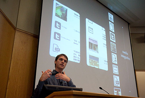 Gordon was joined by Kyle Parry, who is project manager and digital researcher at the metaLAB (at) Harvard, and Eric Dinmore, Reischauer Institute postdoctoral fellow and assistant professor of history at Hampden-Sydney College. With Theodore Bestor, chair of the Department of Anthropology, as moderator, the panel discussed the logistical, legal, and ethical challenges posed by designing an interface for the vast reams of information, some of it highly personal, produced by the disaster.