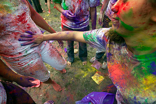 During the Holi celebration, hosted by Dharma, Harvard’s Hindu Student Association, Akanksha Sharma ’14 (right) and other students cloud the air with a rainbow of colorful powder in the Malkin Athletic Center Quad.