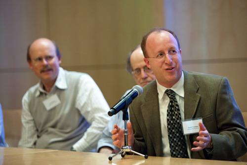 The disease is mistakenly viewed as a problem of poverty. “TB doesn’t discriminate; anyone can get it,” said panelist Khisimuzi Mdluli (right). The symposium, moderated by Barry Bloom, focused on the reasons for the emergence of drug-resistant TB and what can be done to remedy this growing crisis. Among the panelists was Sarah Fortune (left), the Melvin J. and Geraldine L. Glimcher Assistant Professor of Immunology and Infectious Diseases at the Harvard School of Public Health.