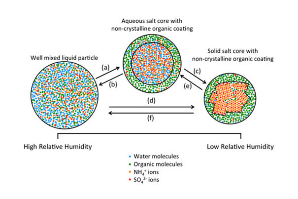 “We’ve confirmed experimentally that changes in relative humidity can separate the organic and inorganic material in individual atmospheric particles into distinct liquid phases, much like oil separates from water,” says UBC Associate Professor Allan Bertram, director of the collaborative research and training program on atmospheric aerosols at UBC and co-principal investigator on the paper.