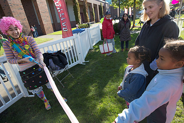 Julie Zauzmer ’13 (a.k.a. Zippy the clown) makes a balloon hat for Brighton residents Cora Maddax, 8 years old, and her sister 5-year-old sister Laney Maddax, while their mother Victoria Myers looked on. More than 1,000 Cambridge and Allston-Brighton residents turned out for the 23rd Community Football Day on Oct. 13.