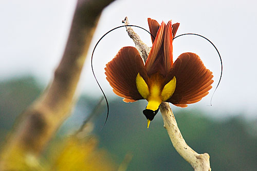 Adult male greater bird of paradise shaking his plumes as part of his display. When attracting a female, the male will turn away from the female on a downward-sloping branch so his yellow plumes are displayed in an “explosion of color.”