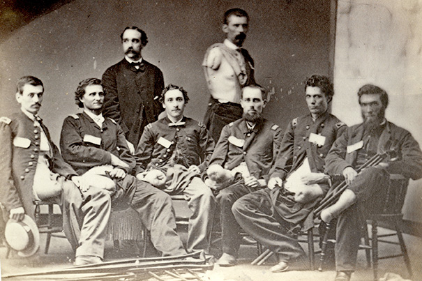 Here is a group of officers who have undergone amputations for gunshot injuries, as published in “Photographs of surgical cases and specimens / prepared by direction of the Surgeon General by George A. Otis.”
