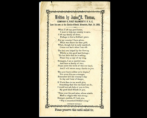 There are examples of the mendicant literature that enabled hobbling and hampered veterans to make a living on the streets by selling pamphlets and broadside poems. “Please buy a copy of my song,” reads one, the work of Pvt. James R. Thomas, who lost an arm at the Battle of South Mountain. “Please assist the work of this one hand, and I will return many thanks to you.”