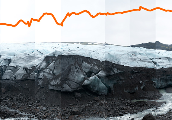 The Solheim Glacier in Iceland in February 2009. The line represents how much the glacier changed in nearly three years. Photo by James Balog/Extreme Ice Survey