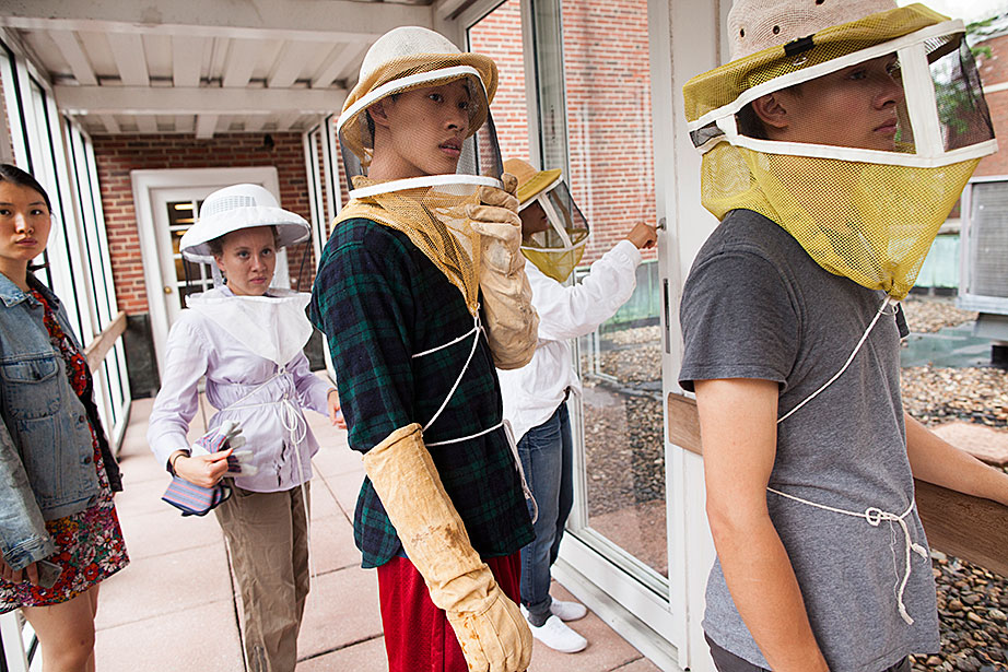 Half a dozen undergraduates took short, hesitant steps as they headed onto a small section of the Pforzheimer House roof. Li Murphy was the exception. The energetic junior moved directly toward a small, colorful hive brimming with bees, and quickly launched into an impromptu tutorial.