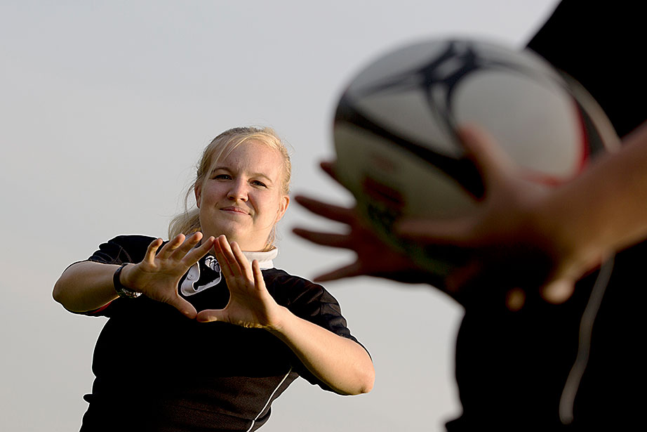 While the varsity status achieved by women’s rugby is important on Harvard’s campus, farther-reaching are the changes the players hope will come in the Ivy League and in women’s rugby on the national stage. Rugby will be played in the Olympics for the first time in 2016. Ball carrier Madison Singell gains yardage against Quinnipiac. Rugby is the only full-contact women’s sport at Harvard. Kellie Desrochers ’13 (left) and Jennifer Middleton ’10 cheer on their former club teammates, now varsity women. Harvard defenders Aniebiet Abasi (top) and Audrey Carson (bottom) take a down a Princeton player (with ball). Helen Clark passes an on-field concussion test administered by athletic trainer Corey Lanois during the Princeton game. Helmets are not required but some players wear them to protect against cauliflower ear, a complication resulting from ear injuries. Cayla Calderwood gets taken down by Princeton defenders. Kellie Desrochers ‘13 (from left), Marlee Morris ’12, and Meg McCarty ’12, an alumnae pack of former Harvard-Radcliffe ruggers, returned to watch their successors battle Princeton. Xanni Brown (left) evades a Princeton defender in a match. Harvard won, 36-0. Audrey Carson, foreground, and others work on passing techniques. Lenica Morales-Valenzuela (from left), Hope Schwartz, Ali Haber, and Xanni Brown react to coach Sue Parker’s practice plan. Head coach Sue Parker brought extensive experience to Harvard, including most recently serving as the coach for Navy. Assistant coach Sue Whitwell observes the underside mechanics of the scrum. Brandy Machado grips Rachael Stein’s legs during a scrum technique drill. Aniebiet Abasi (left) and Kaleigh Henry focus on improving strength in a pushing drill. Helen Clark works on her catching technique in practice. Rachael Stein (forefront) and teammates warm up before playing Quinnipiac in their first match as a varsity squad.