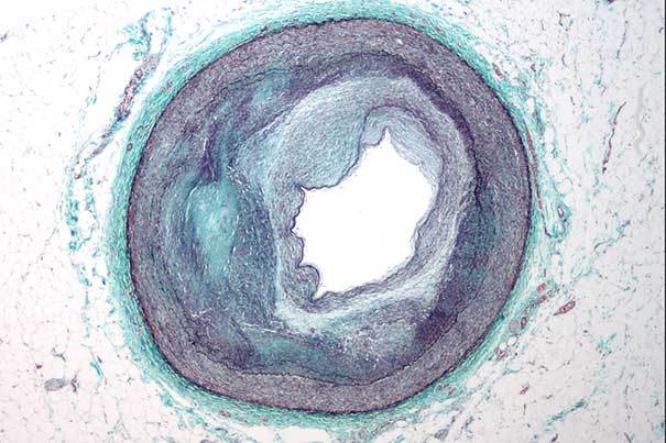 Pictured is a micrograph of an artery that supplies the heart showing significant atherosclerosis and marked luminal narrowing. Researchers have found a way to discourage inflammatory cells from changing the artery’s surface, which attracts the build-up of plaque, leading to heart attacks, strokes, and other inflammatory diseases.