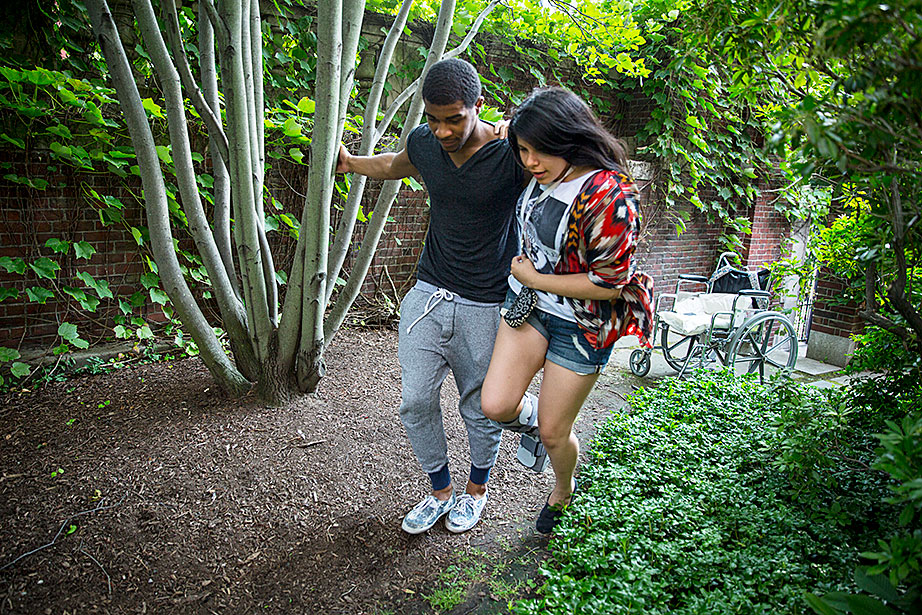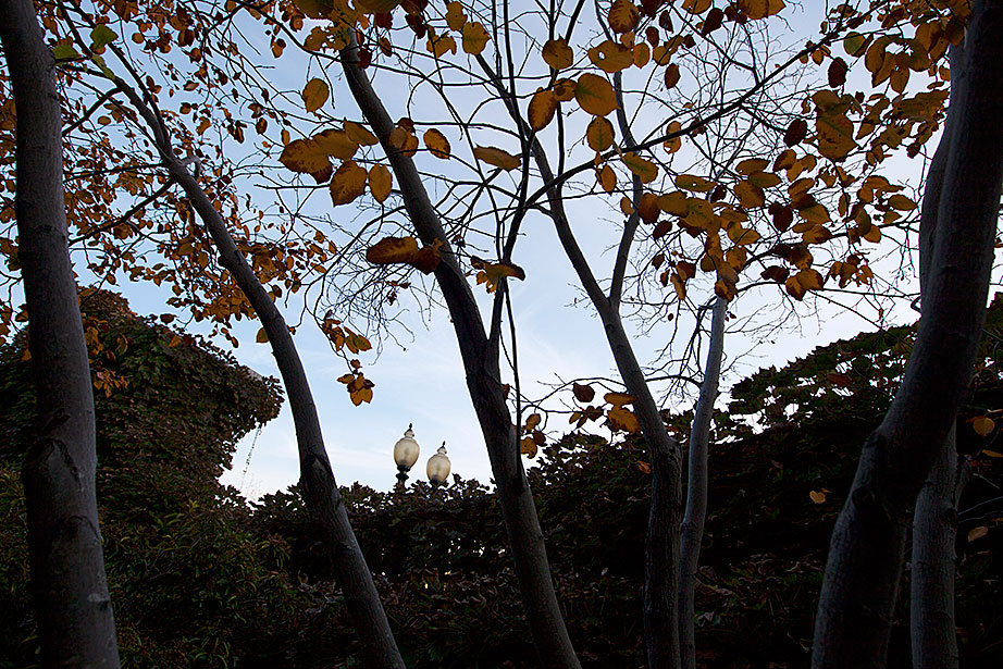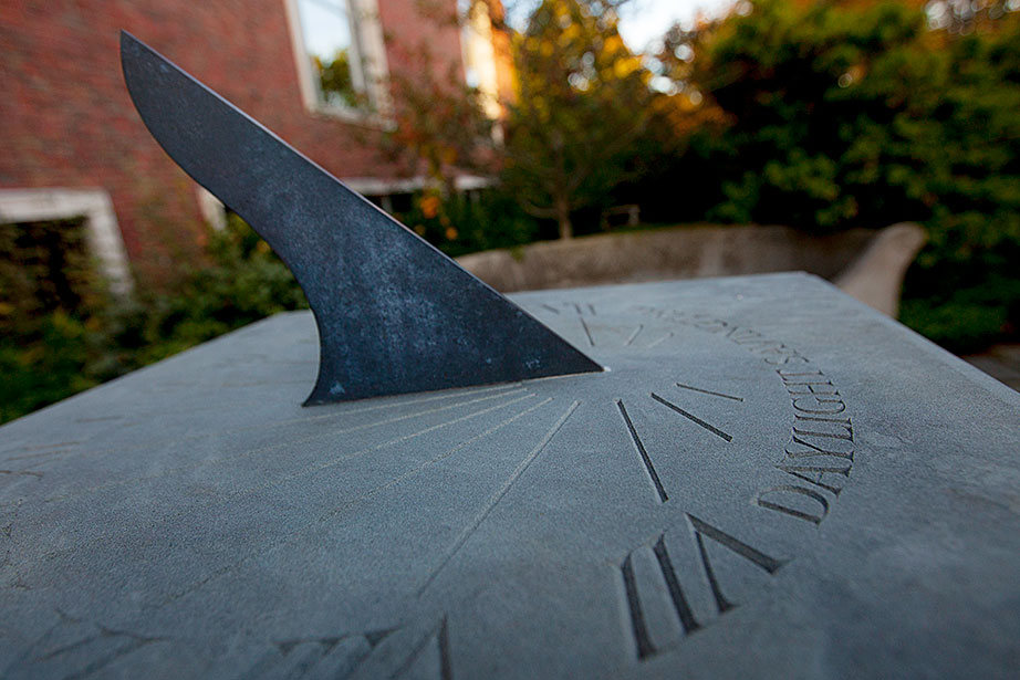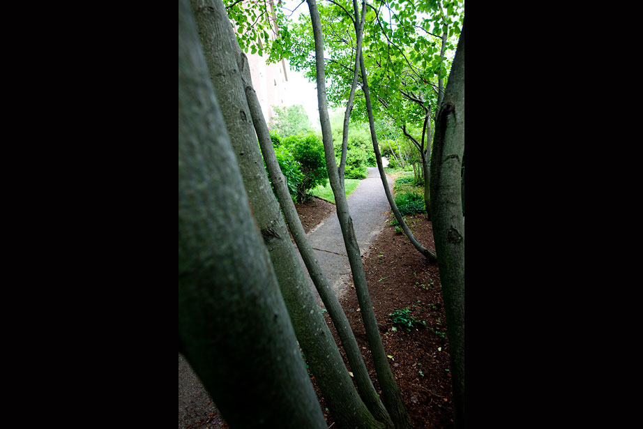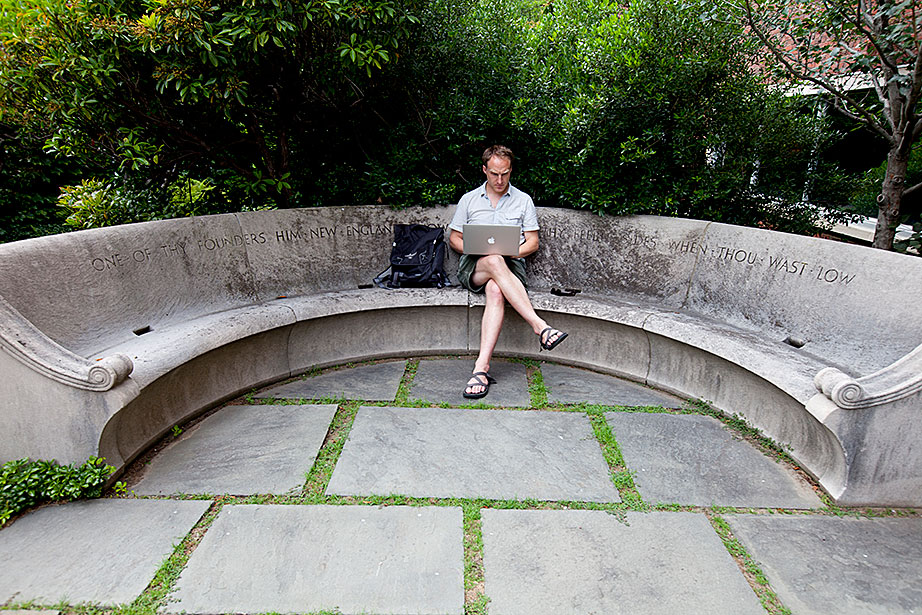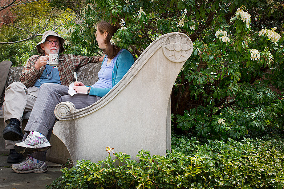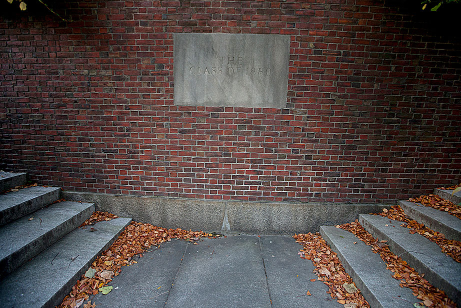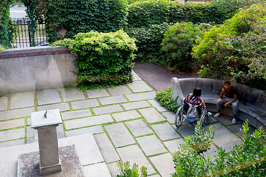 An overview of Dudley Garden from the Ginsberg Reading Room inside Lamont Library. The College Library and Faculty of Arts and Sciences restored Dudley Garden as part of Lamont Library’s 50th anniversary in 1999. Charles Eliot Professor in Practice of Landscape Architecture Michael Van Valkenburgh contributed to the restoration with a design that emphasizes native plants, like this row of trees to line the entrance walkway. Gerry Ambroise walks the garden — shared with birds, squirrels, and bunnies ― with Annielly Camargo, a student in Crimson Summer Academy. Created in 1949, the garden honored Thomas Dudley, the Bay Colony governor and the father of poet Anne Bradstreet. A swath of ivy blankets a shady area near the entrance. The inscription detailing Thomas Dudley’s accomplishments is all that remains of the original Dudley Garden gate. Research librarians Fred Burchstead and Anna Esty enjoy lunch in Dudley Garden. According to a spring 2000 Harvard Magazine article, during the revolutionary days of 1969, this Massachusetts Avenue entrance to the Dudley Garden was closed “on account of various naughtinesses occurring within.” A gnarly tree trunk and a browned autumn leaf share ground space. William J.H. Andrewes, former curator of the Collection of Historical Scientific Instruments at Harvard, designed this bluestone sundial. Andrewes spoke at the garden’s unveiling in 1999, and invited guests into “the peace and tranquility of the garden, where time is measured in shadows.” The sky turns azure as the sun sets above the garden.