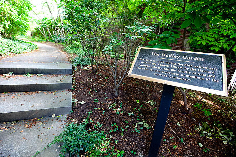 Walking into the Yard from Massachusetts Avenue, keeping Wigglesworth to the right, visitors come to a wrought-iron fence with a gate. Here, tucked behind Lamont Library, lies a little treasure called Dudley Garden.