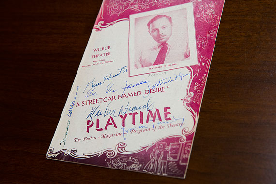 A playbill for the 1947 run of Williams’ “A Streetcar Named Desire” at Boston’s Wilbur Theatre includes autographs from Marlon Brando, Jessica Tandy, and Tennessee Williams along the side.