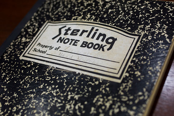 A personal journal kept by Tennessee Williams is part of Houghton Library’s holdings. Next to the world school on the journal’s cover, Williams wrote “hard knocks.”