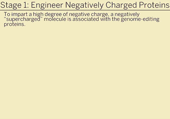 “We had the very simple idea to use the same commercially available cationic lipids researchers use to deliver DNA and RNA to deliver proteins. But instead of using superpositively charged proteins, we use supernegatively charged proteins, which resemble nucleic acids in their highly negatively charged state,” Liu said. “The potency of delivering proteins that are associated with highly negatively charged molecules using cationic lipids is approximately 1,000 times greater than delivering proteins using positively charged proteins or peptides.”