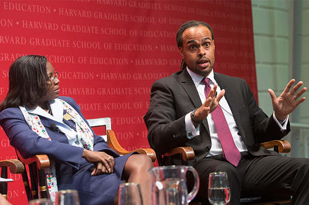 Tiffany Anderson (left), superintendent of the Jennings, Mo., school district, and Tracey Benson, Ed.L.D. ’16, were panelists Monday night at an Askwith Forum titled “Ferguson and Beyond: Educational Strategies to Address Racism and Social Injustice.”