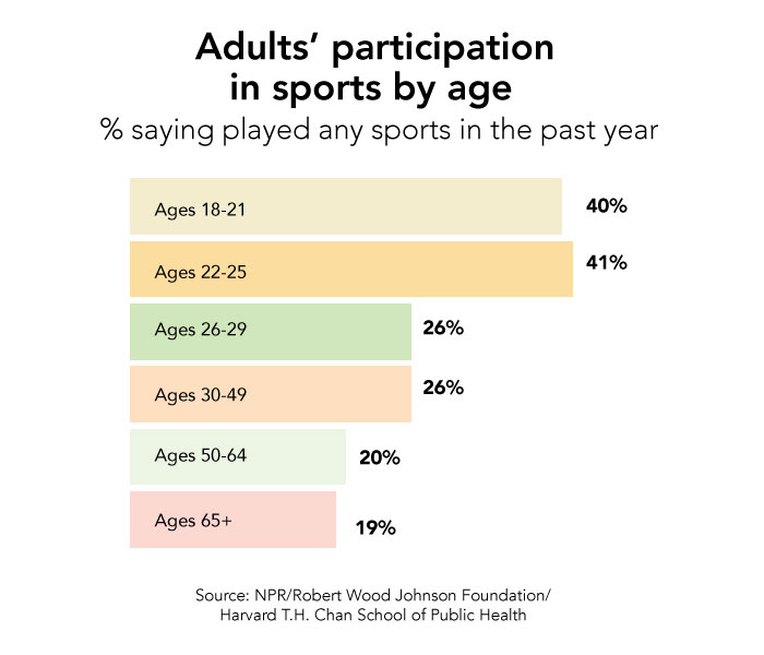 The study revealed that while 40 percent of 18- to 21-year-olds, and 41 percent of 22- to 25-year-olds, play sports, only 26 percent of 26- to 49-year-olds do so, and just 20 percent of adults 50 and over.