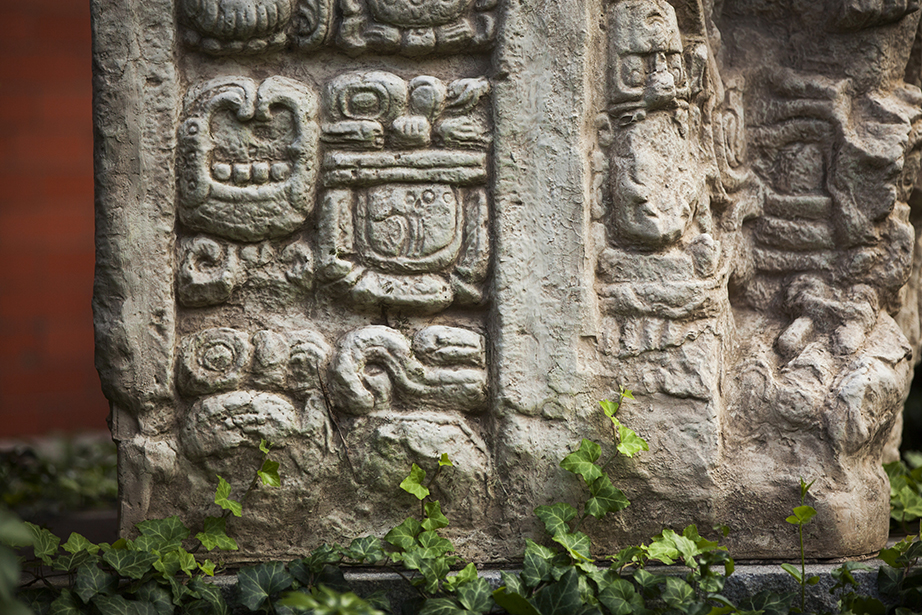 An aspect of Oracle: Portentous by Marianna Pineda, which sits beside the Schlesinger Library on the grounds of the Radcliffe Institute for Advanced Study. Presence by Mary Frank is at Hamilton Hall at Harvard Business School. The marble stele Harvard Bixi sits outside Widener Library. Night Wall I by Louise Nevelson is at Hauser Hall at Harvard Law School. Latent (e)Scapes by Christina Geros MAUD, M.L.A. ’15, lights up Radcliffe Yard. An untitled 2003 work by Joel Shapiro at Morgan Hall at Harvard Business School. Over the Earth by Tony Cragg is at the Dean’s House at Harvard Business School. Daniel Chester French’s ever-popular John Harvard Statue in front of University Hall draws crowds of visitors. A fountain in Radcliffe’s Sunken Garden. Alexander Calder’s Onion adorns the Pusey Library. Katherine Ward Lane Weems’ rhinoceroses Vicky and Bess flank the doors at the Biological Laboratories. Red, Blue by Ellsworth Kelly is at Peabody Terrace. A Chinese lion stands guard in front of the Harvard-Yenching Library. Surfacing Stone by Martin Bechthold at Gund Hall at the Harvard Graduate School of Design. Peter Walker designed the Tanner Fountain at the Science Center. Child Hall at Harvard Law School. Appropriately, Myron’s Discobolus welcomes athletes to the Hemenway Gymnasium. A reproduction of the bronze lion erected in the 12th century in the castle square in Brunswick by Duke Henry is now at the Center for European Studies. The Peabody Museum has a replica of a classic Maya stele from the ruins of Copan.