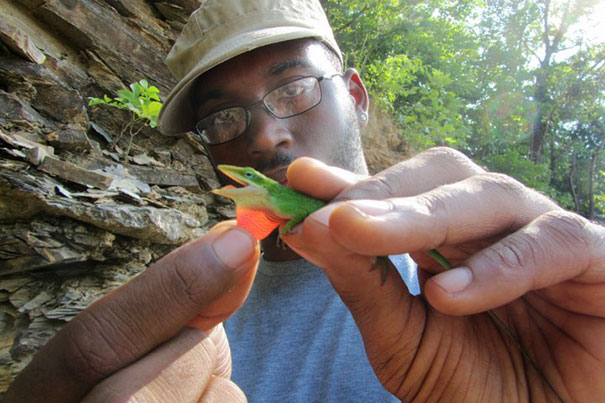 Shane Campbell-Staton, Ph.D. ’15, with a green anole during a collecting trip before the 2013–14 polar vortex. On a subsequent collecting trip, he found greater cold tolerance among the species.
