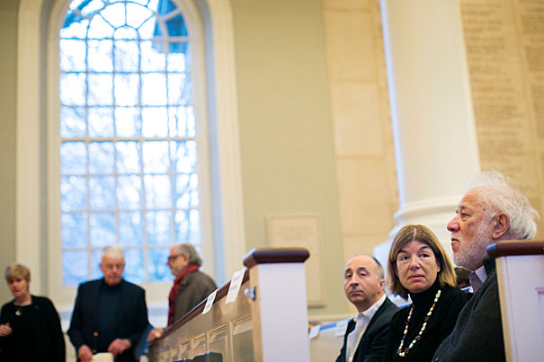 Before the event begins, James Wood (from center), Claire Messud, and Michael Ondaatje gather their thoughts in the Memorial Church pews. Stephanie Mitchell/Harvard Staff Photographer