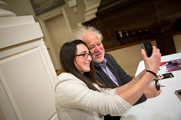 Chloe Feuerstein, a history student from Simmons College, poses for a selfie with Michael Ondaatje in Memorial Church at Harvard University. Stephanie Mitchell/Harvard Staff Photographer