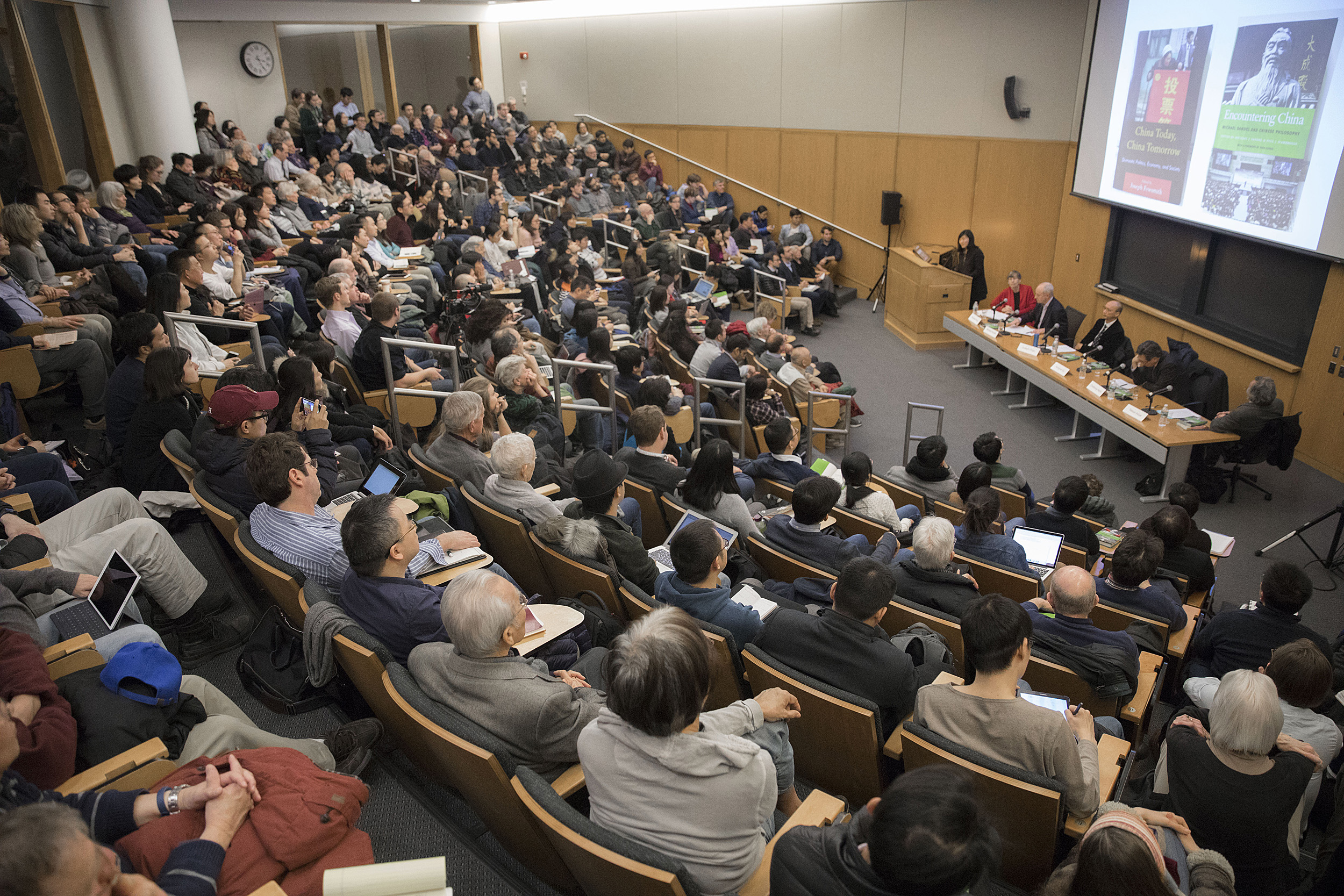 A packed house attended to hear panelists Qu Hongmei of Jilin University (from left), Elizabeth Perry, Michael J. Sandel, Joseph C.W. Chan, Hahm Chaibong, Tatsuo Inoue, University of Tokyo, Japan, inside the Tsai Auditorium in CGIS South.