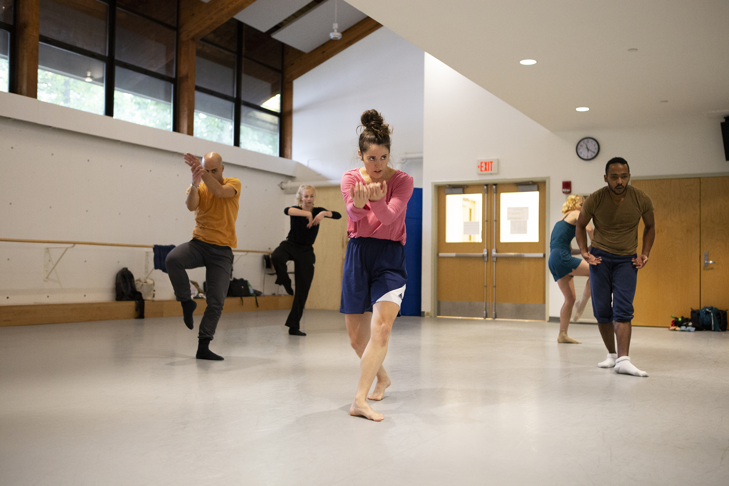 Jessie Jeanne Stinnett (top from left), Benedikt, Miccolis (bottom from left), Hannah Kickert and Henoch Spinola rehearse a tower formation.