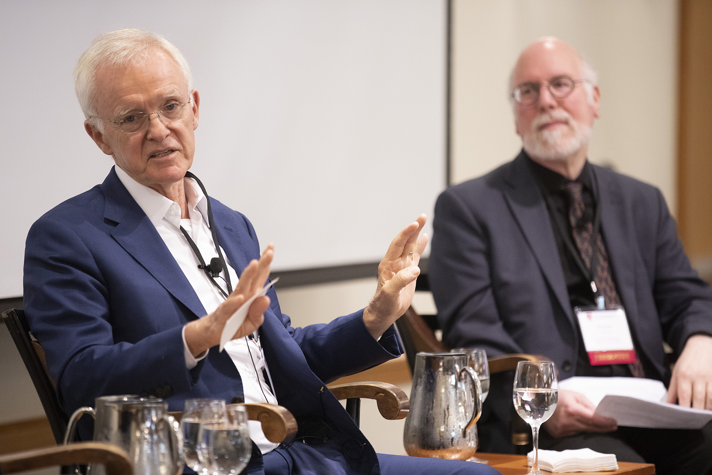 Stephen Kosslyn (from left), Dean Claudine Gay, (center) and Sen. Bob Kerrey discuss educational practices and the science of learning during the HILT conference “The Intentional University.”