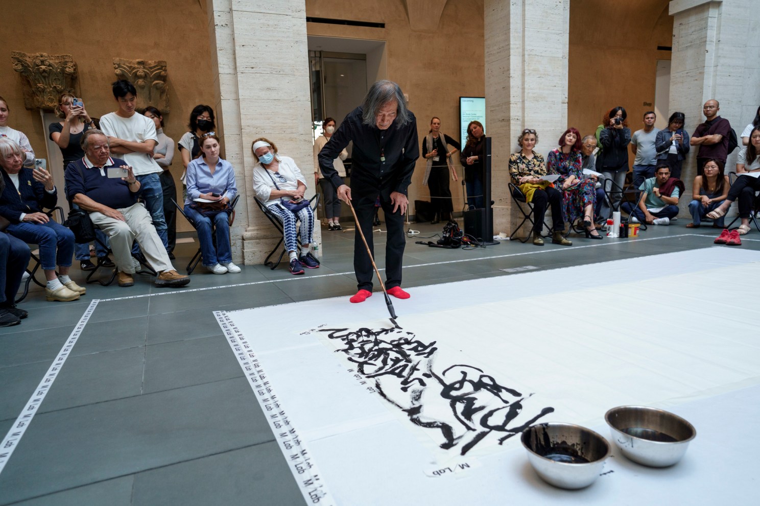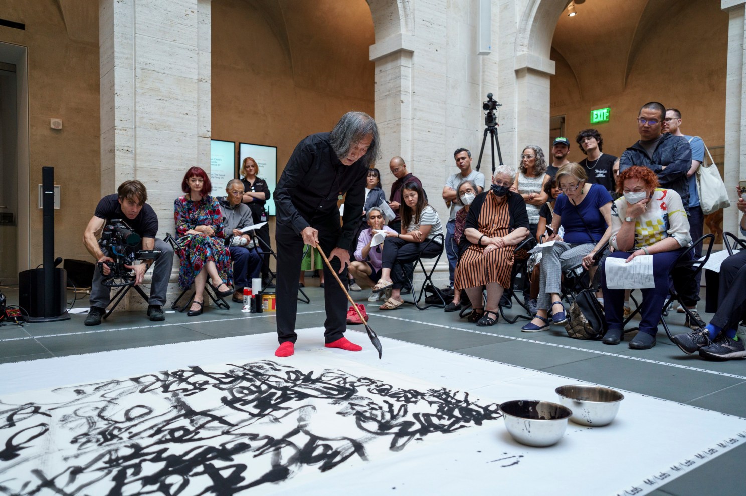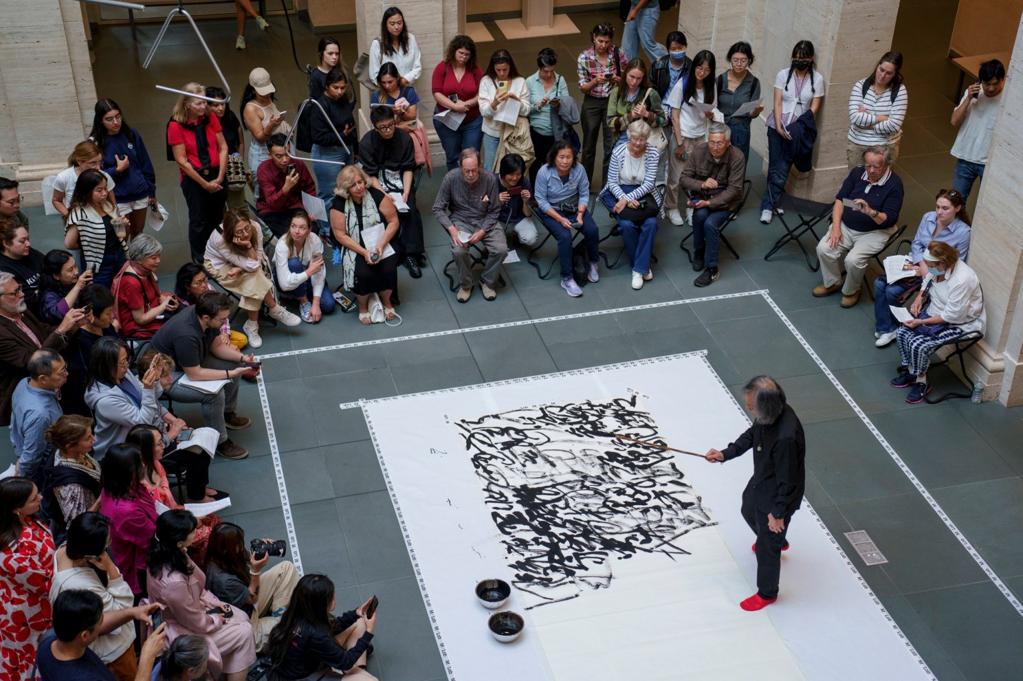 Onlookers gathered on both the ground and balcony levels to watch Dongling in action. Making swooping, inky strokes, the almost 80-year-old artist got lost in the work — placing characters in a way that looked almost predetermined, despite the improvisational nature of his process.