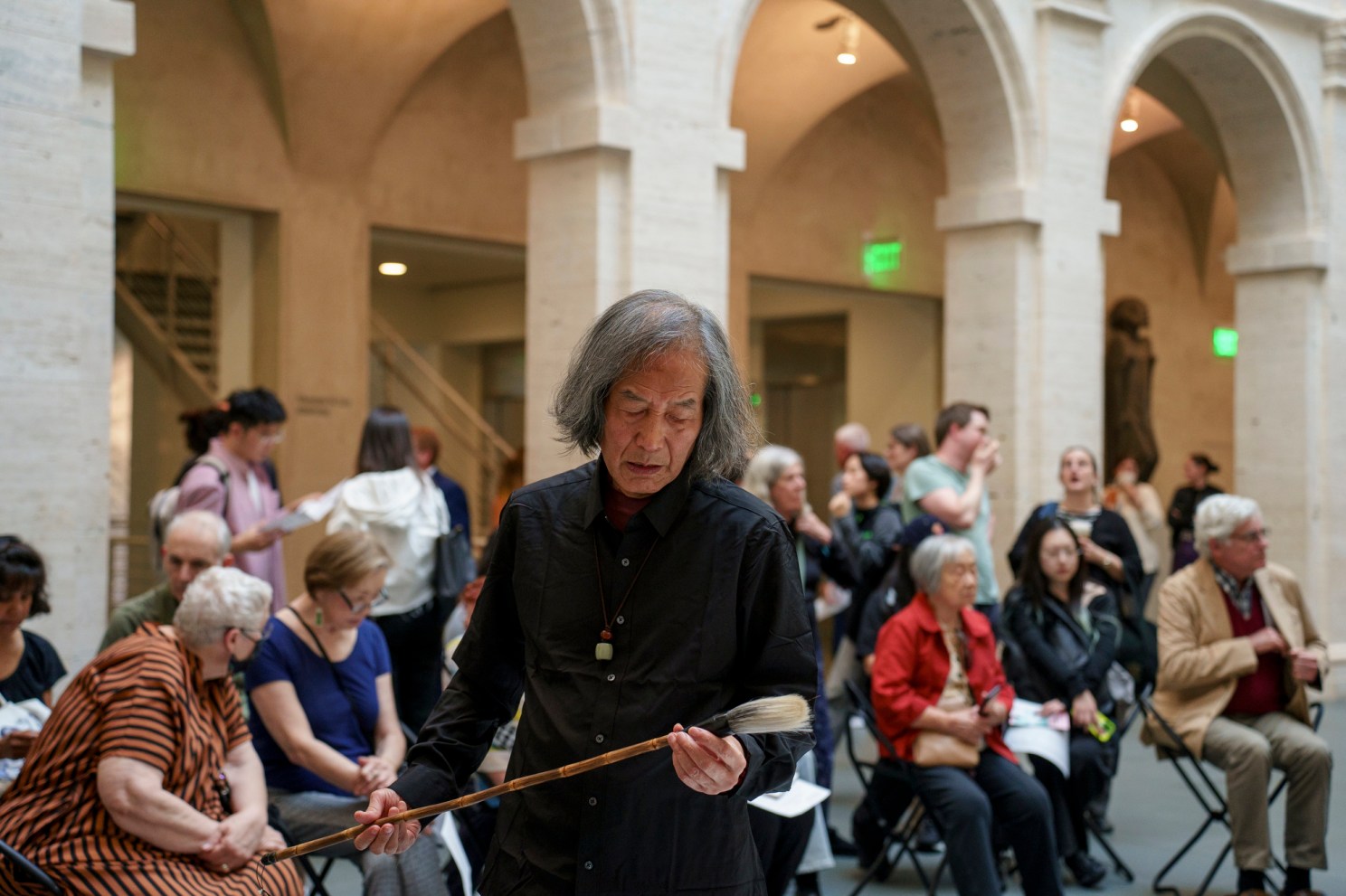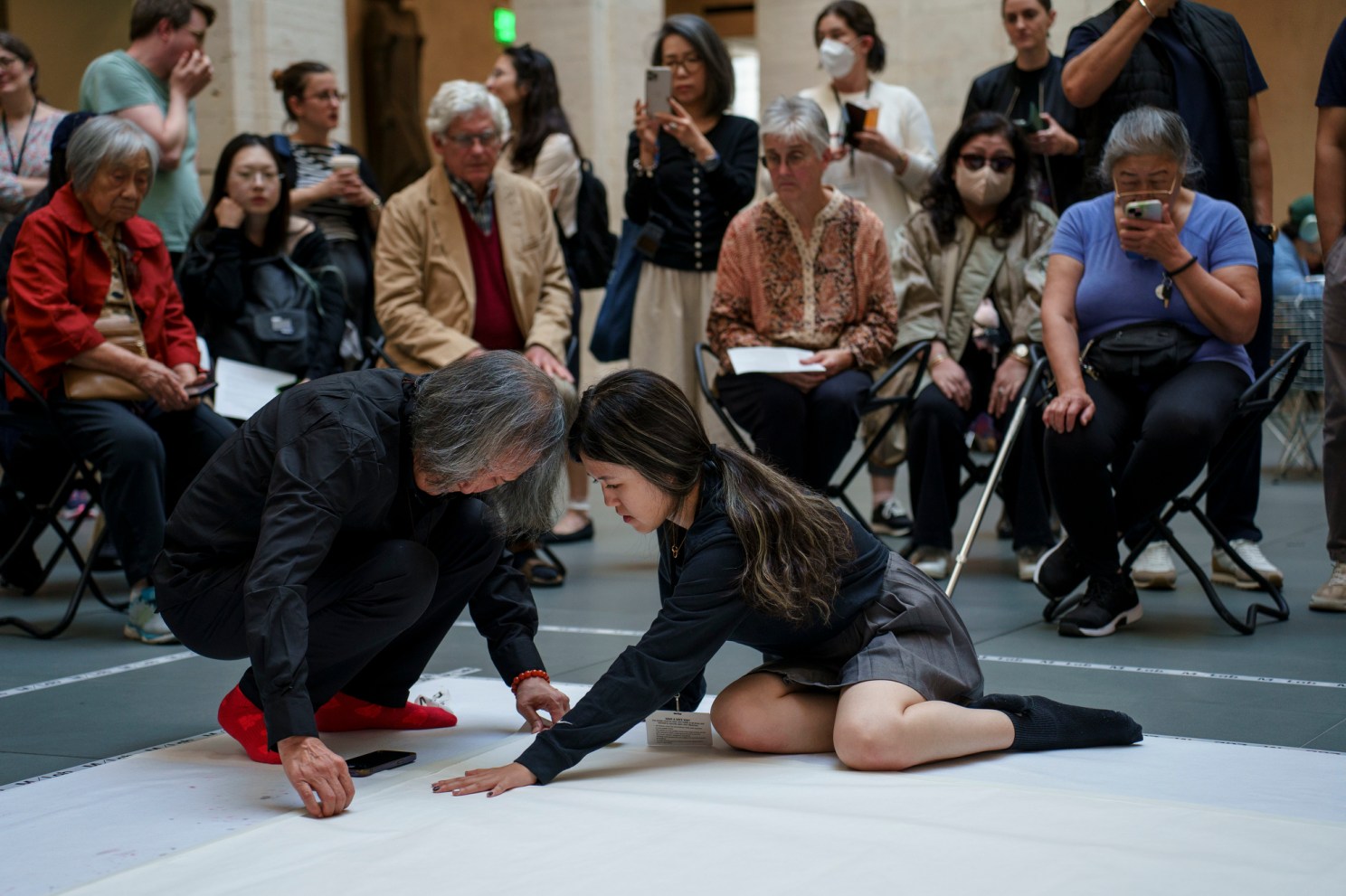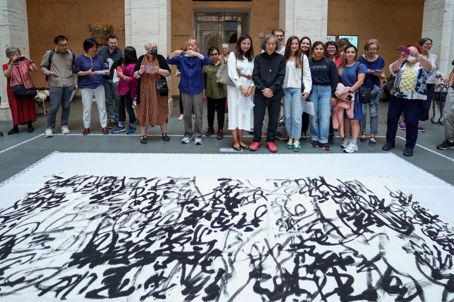 Onlookers gathered on both the ground and balcony levels to watch Dongling in action. Making swooping, inky strokes, the almost 80-year-old artist got lost in the work — placing characters in a way that looked almost predetermined, despite the improvisational nature of his process.