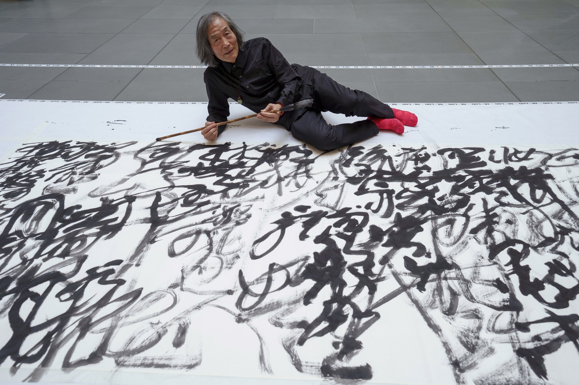 His style, she said, “could be seen as a descendant of the ‘wild cursive script’ of the Tang dynasty. However, he also draws inspiration from Abstract Expressionism, choosing to layer his characters on top of each other, and integrating physical performance into his practice — elements that have never been used in combination before.”
