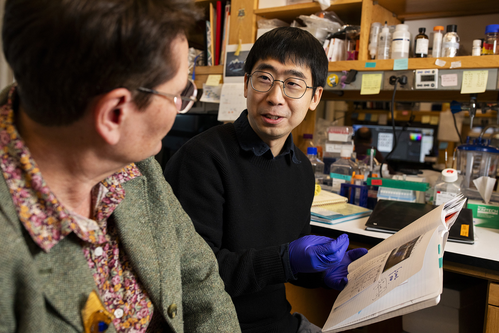 Ding Liu (right), a postdoctoral researcher in the lab of Catherine Dulac (left).