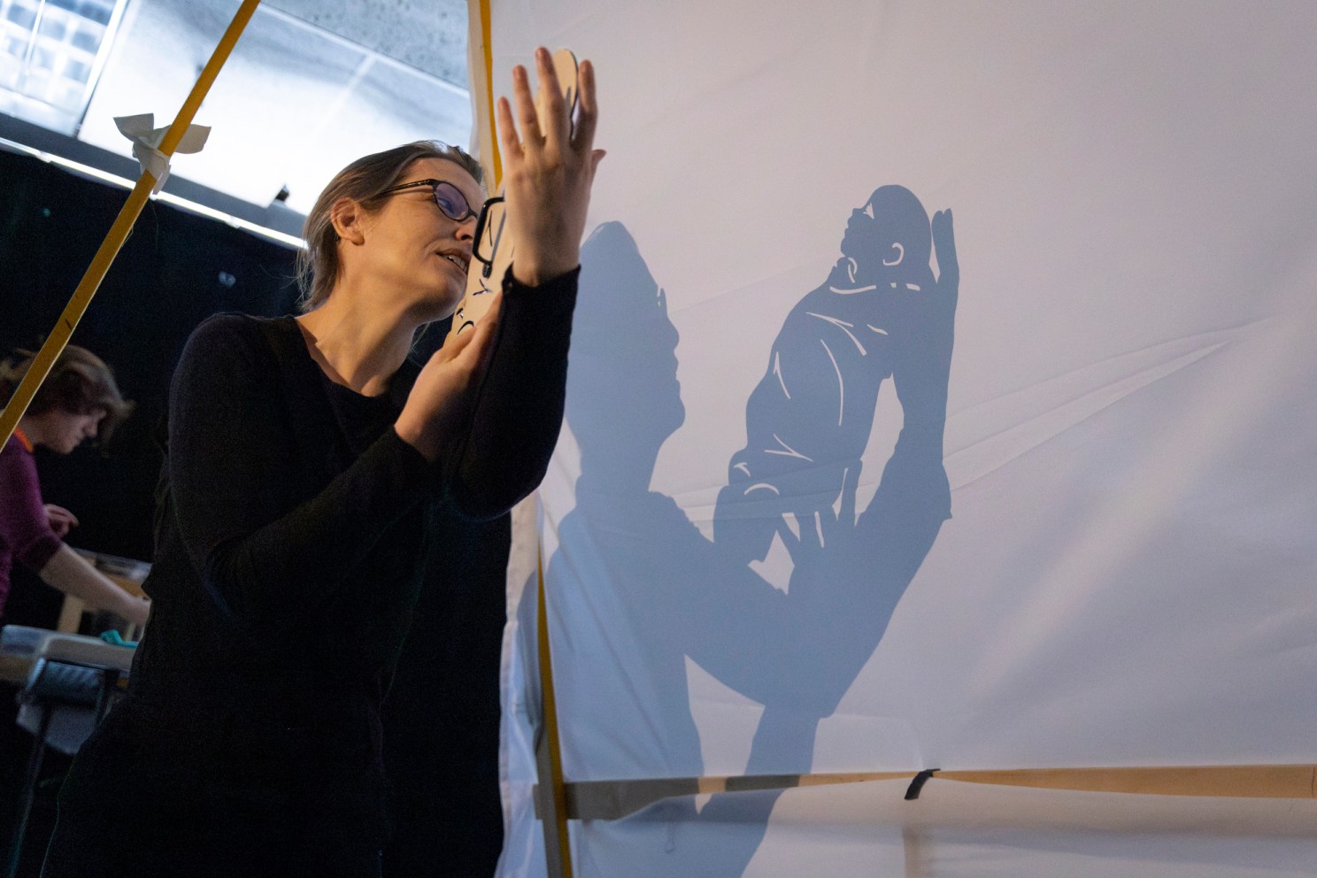Kate Brehm knelt behind a backlit screen in a Loeb Drama Center rehearsal room, holding a shadow puppet of the character Penelope from Homer’s “Odyssey.” Brehm and puppeteer Abigail Baird were discussing the movements required to ensure a sharp silhouette of the puppet during a scene in the A.R.T.’s new stage adaptation of the epic poem.